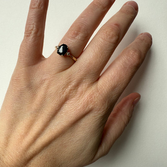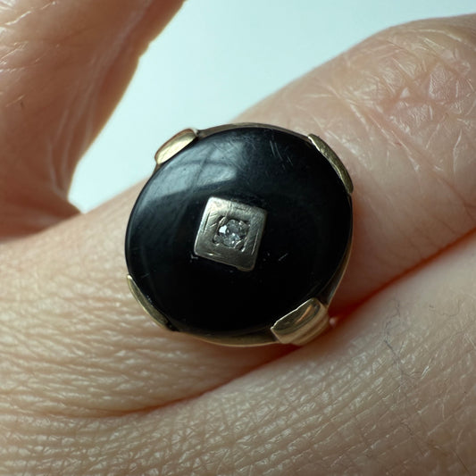 Victorian 10K Oval Black Onyx Diamond Ring Size 5.75