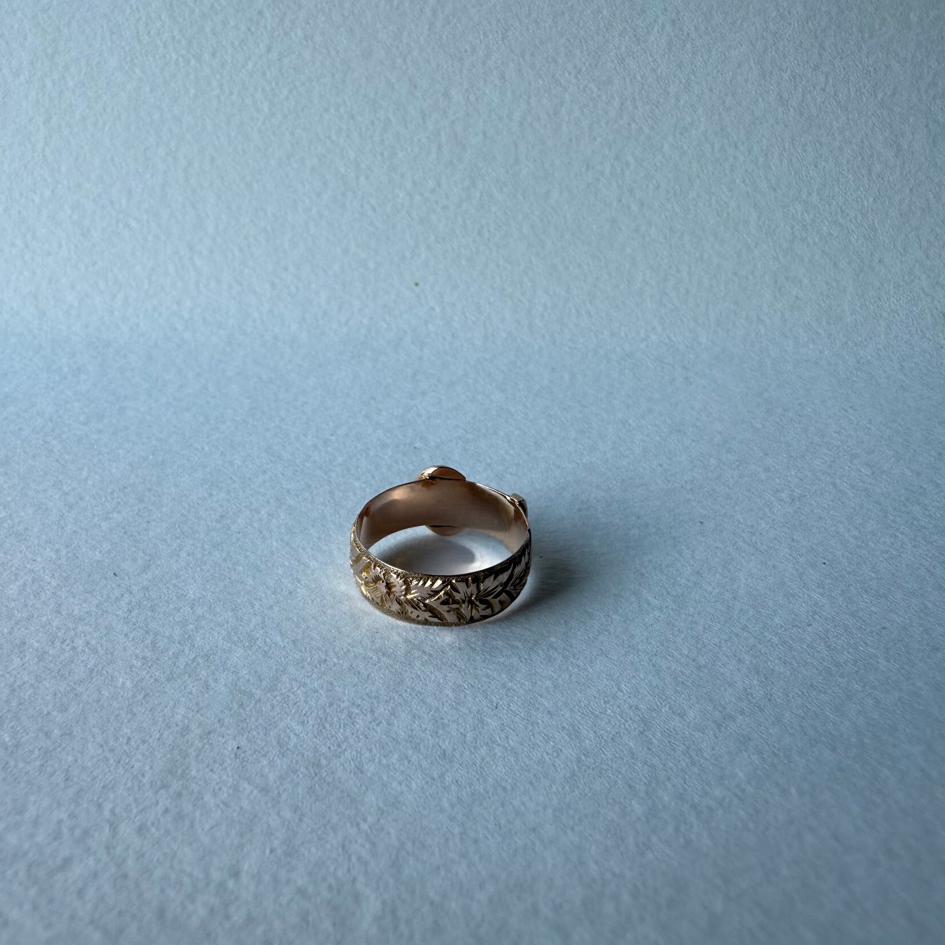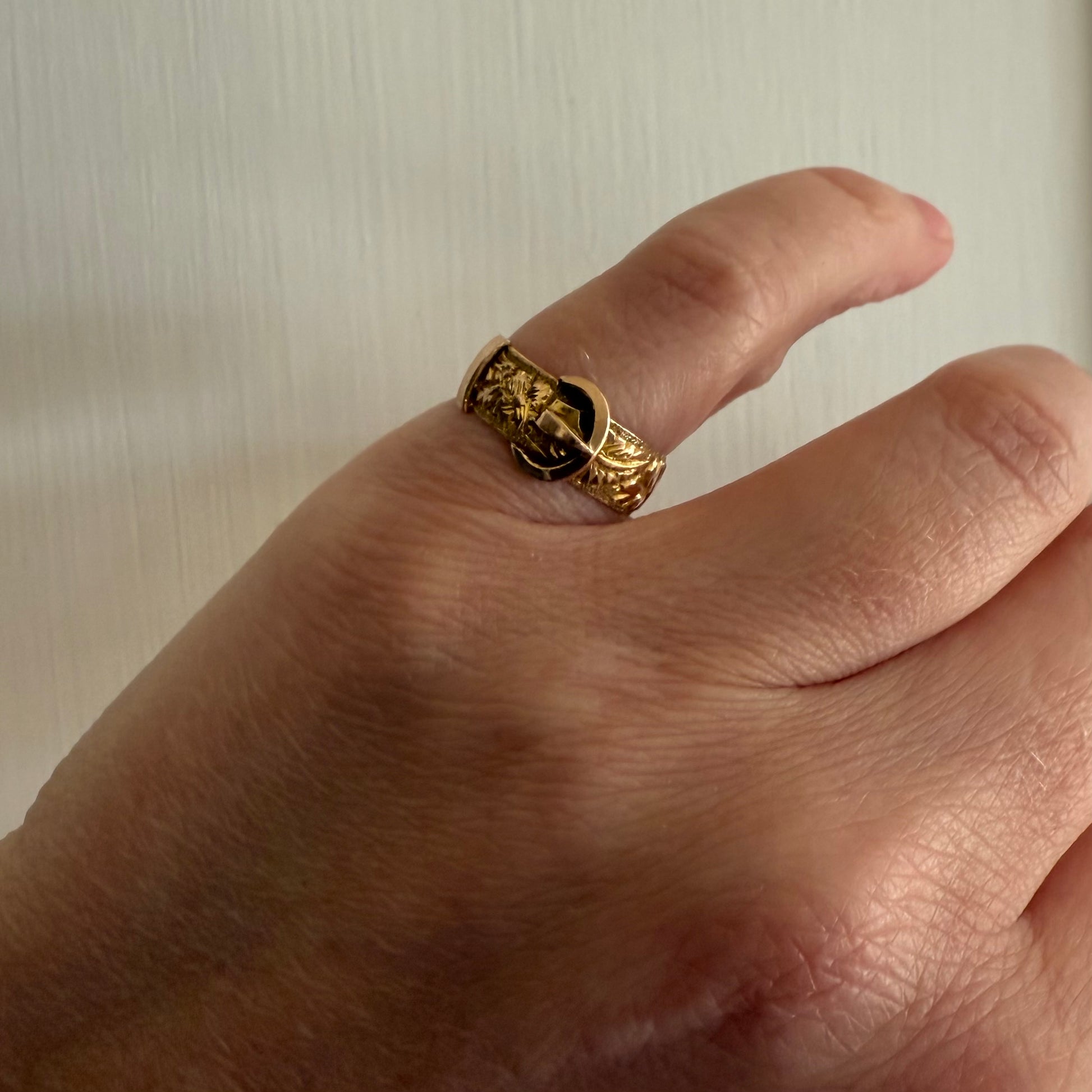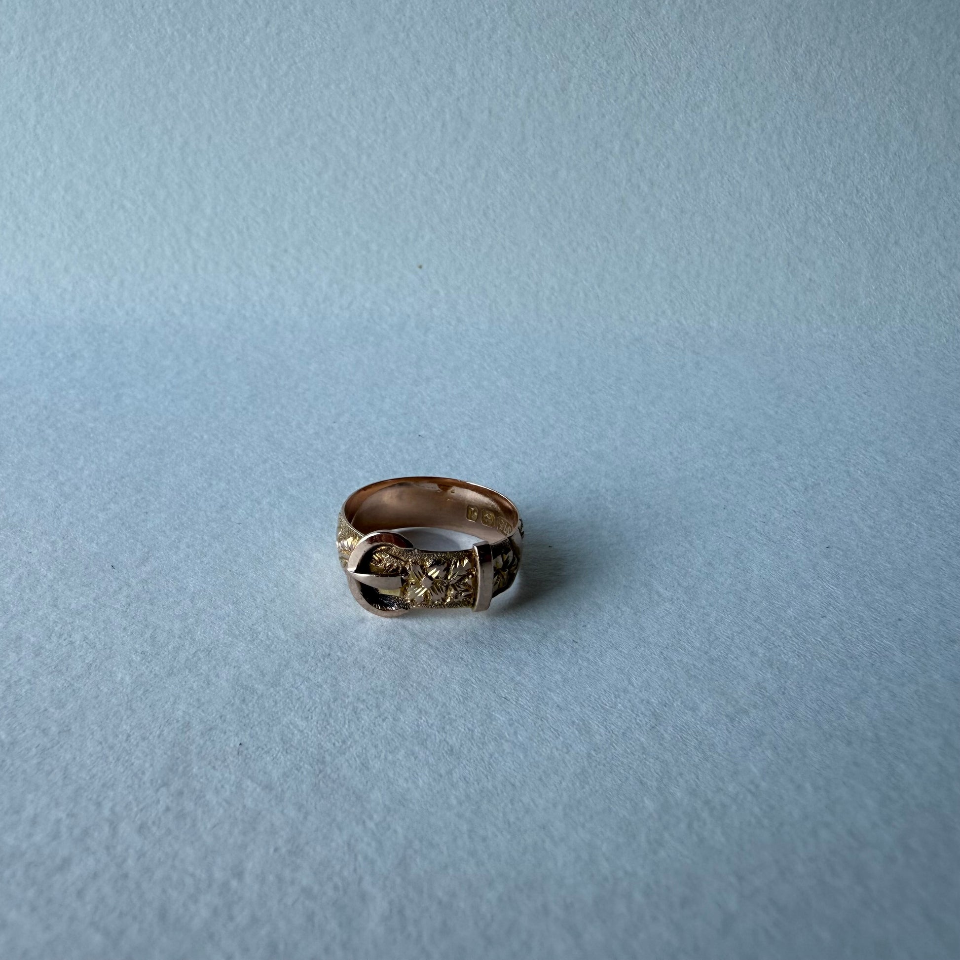 Beautiful genuine Edwardian ring crafted in 9 carat rose gold. The ring has been crafted in the style of a belt buckle. It has hand engraved garlands of flowers crafted all the way around the ring. The ring’s lovely pink tone is eye catching, and the ring is very well made, and possesses the classic quality of well designed Edwardian pieces.