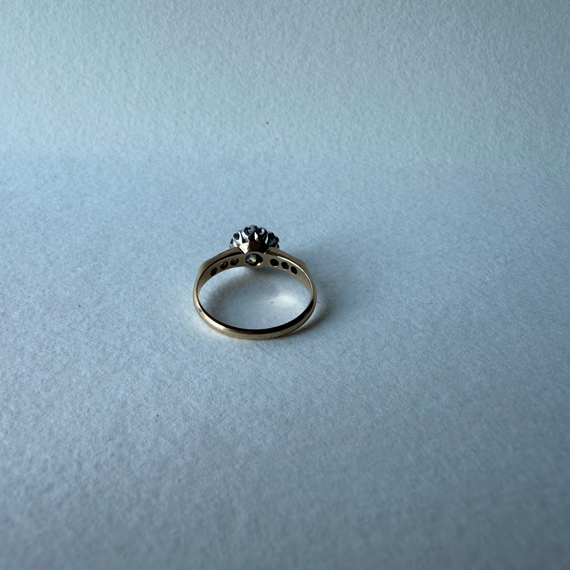 The ring balances boldness and sophistication in a classic cluster silhouette. The warm yellow gold band enhances the brilliance of the diamonds while offering a comfortable and secure fit. Hallmarked for authenticity, this piece is ideal for vintage lovers or as a unique engagement or cocktail ring.